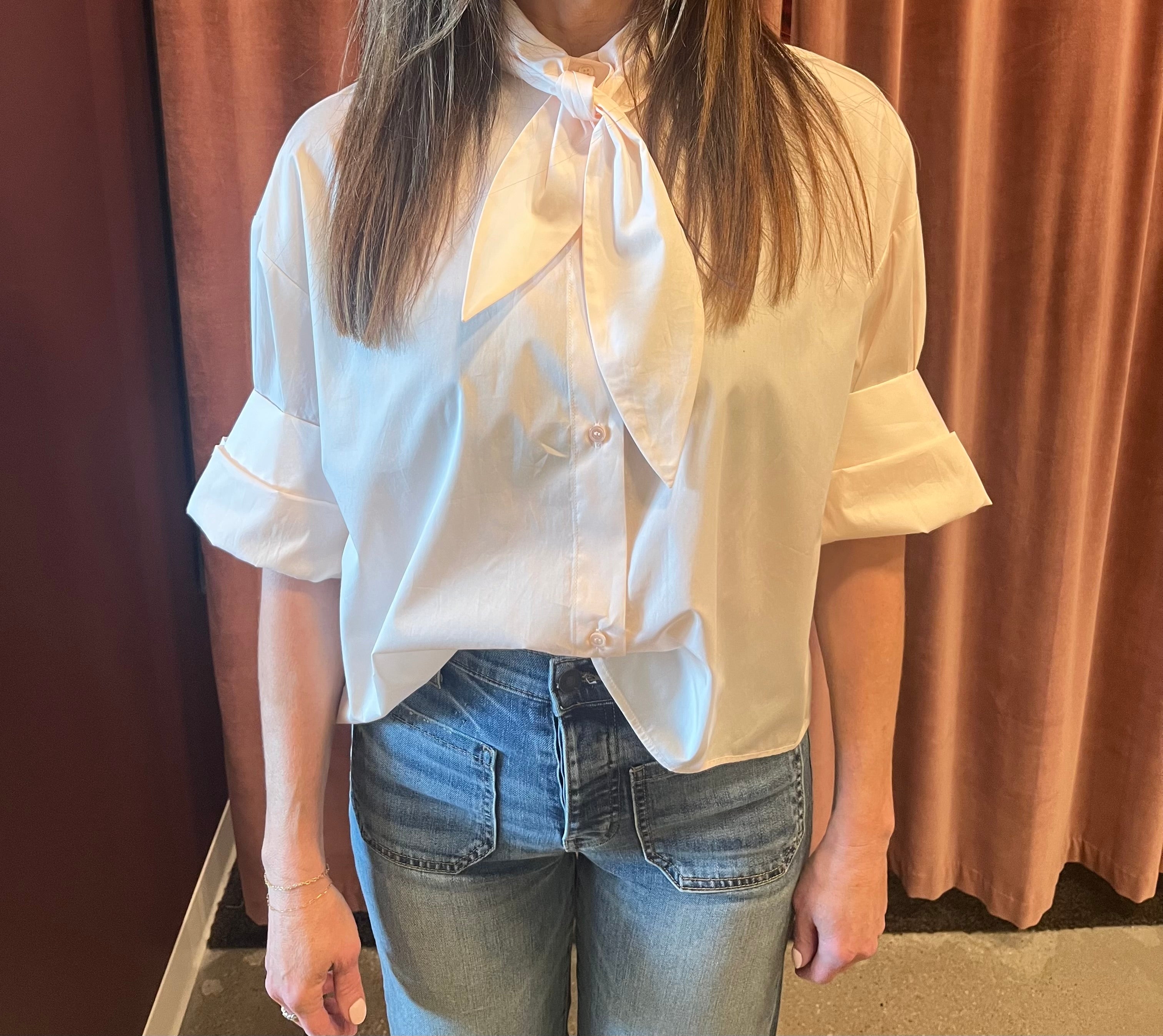 Cropped, short sleeved button down in superfine Italian cotton shirting, with a neck tie at the collar. The Tie One On Shirt is a cropped, boxy silhouette. Complete with a chest patch pocket, button up placket, spread collar, and our signature double roll button cuffs.