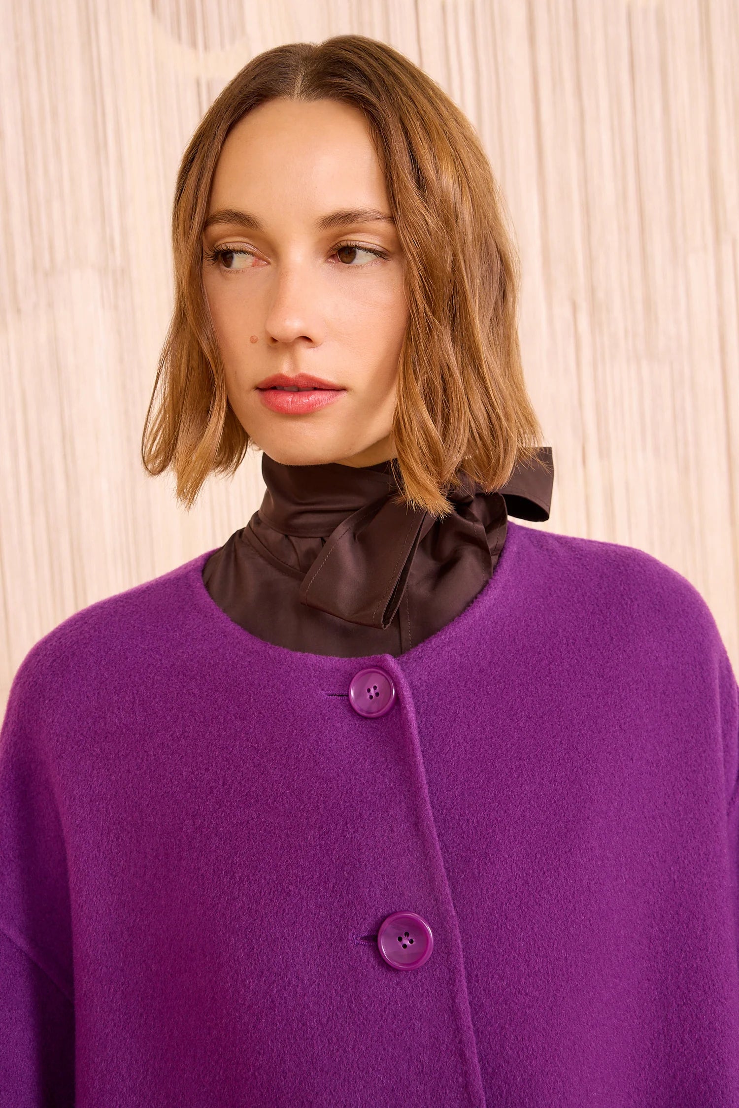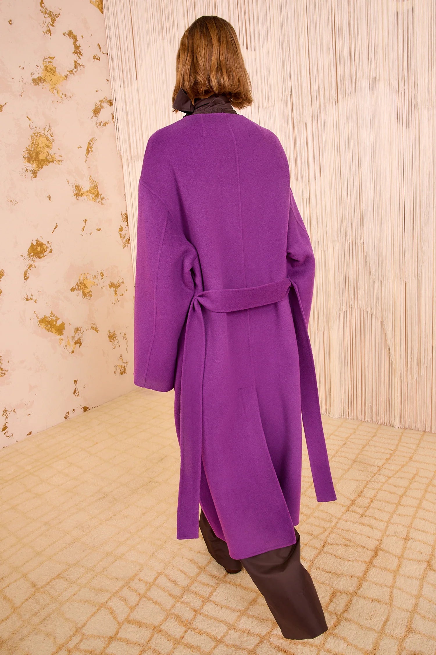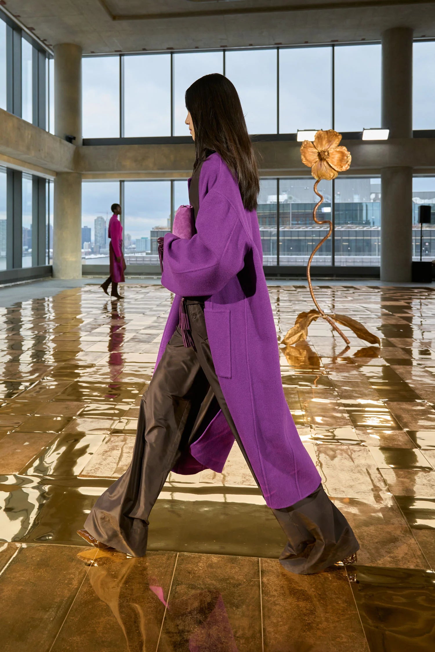 Look 43 of the AW25 runway showcases the Fernanda Coat in our signature double-faced wool and cashmere blend, arriving in a mood-boosting purple hue. This luxurious, single-breasted style features an elongated silhouette and a fabric belt, offering an effortless mix of versatility and comfort.