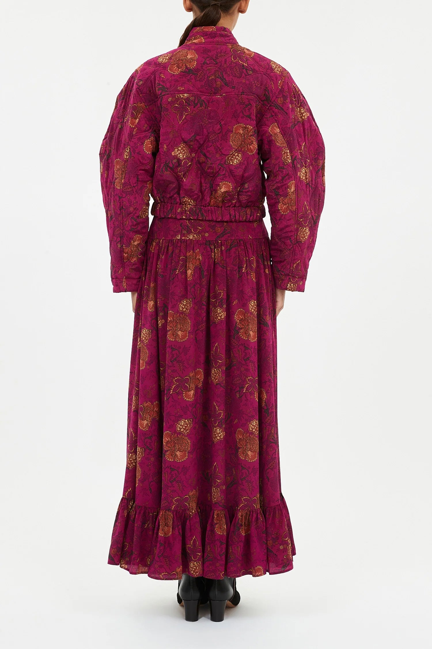 The Lavinia Jacket is saturated with florals inspired by a 19th century French print, enriched with graphic engravings in vibrant hues. Quilted from silk crepe de chine, this jacket is an elevated take on the classic bomber, with sculptural sleeves and an elegantly oversized fit.