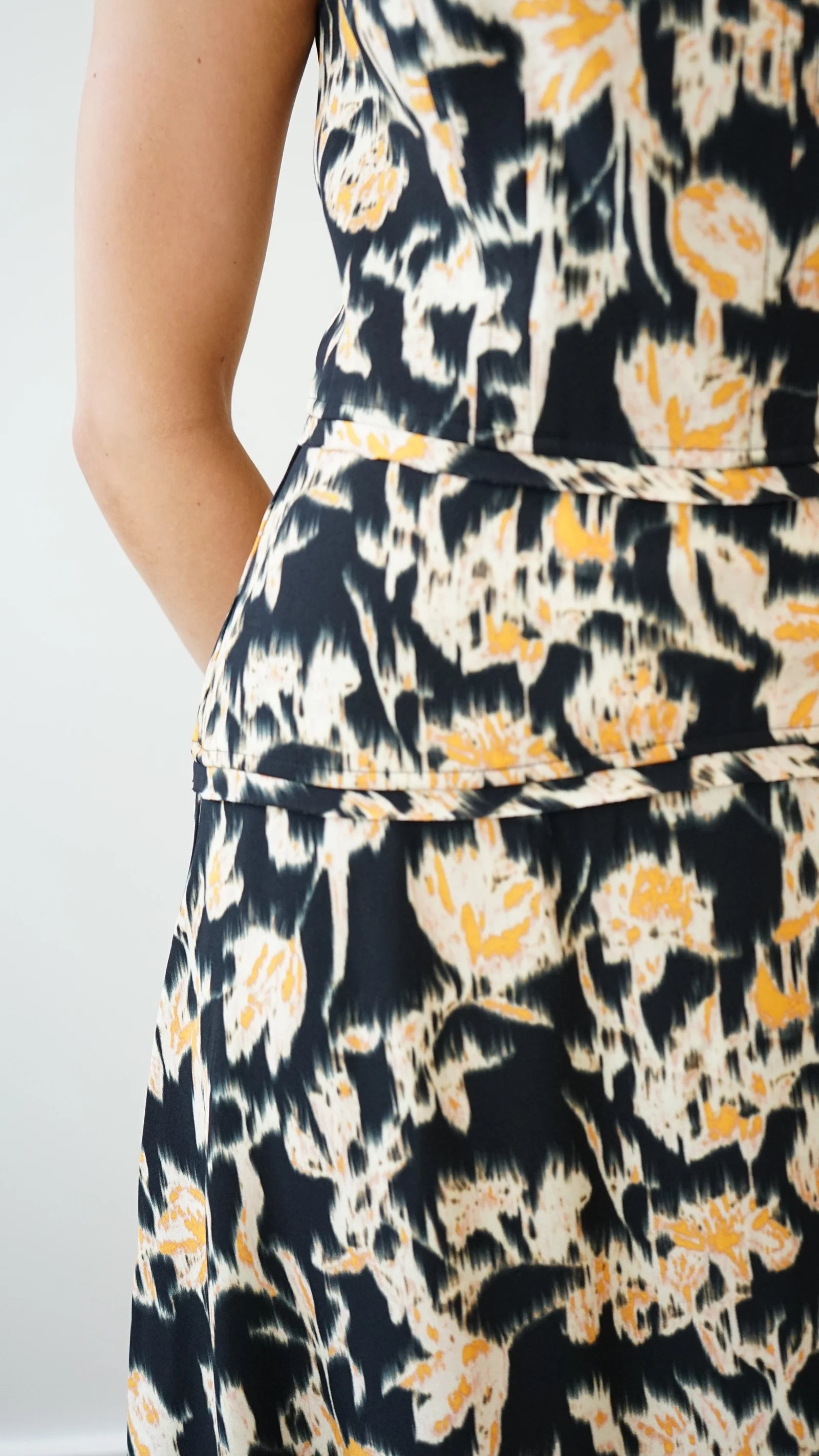 • Designed to be fitted at the bust and waist, flares at hem