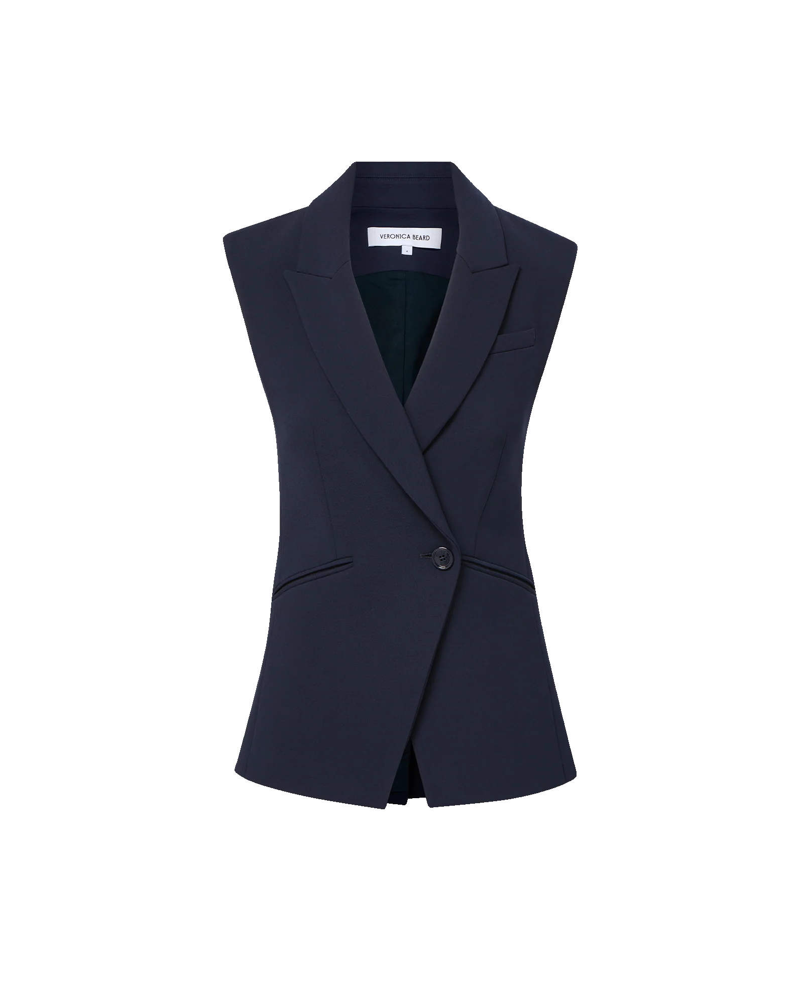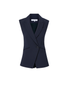 Expertly tailored from our signature Transitional Suiting fabric, the navy Ciel vest is a sleeveless version of a single-breasted blazer. It features thoughtful darting to cinch in the waist, along with clean seaming, angled welt pockets, and a sharp lapel for a streamlined silhouette. Finished with a slight stretch for a comfortable and flexible fit, it's a true wardrobe essential. Pair with the coordinating Arden pant for an outfit that's polished enough for the office and even chicer at night.