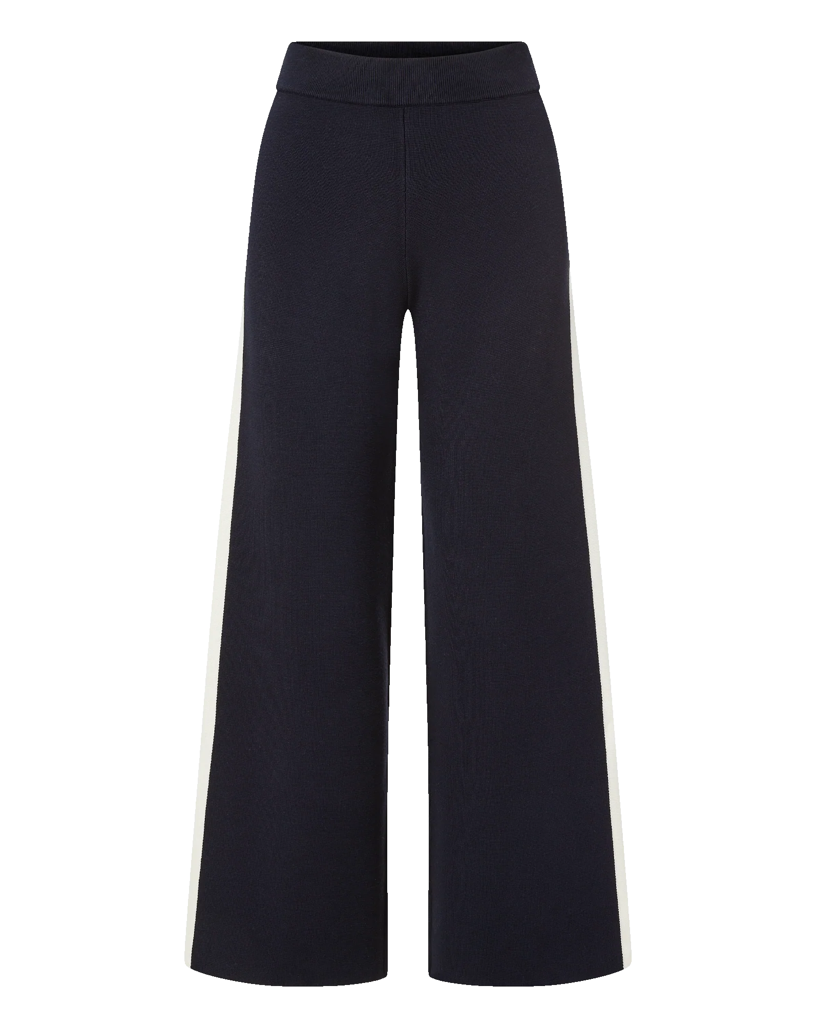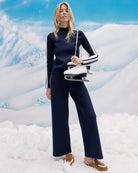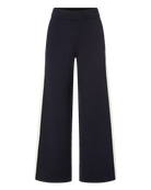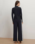 The track pant—elevated. Crafted from a soft navy midweight knit, the Jenkins features a flattering high waist and a relaxed wide-leg silhouette, finished with white double stripes for an athletic touch. Pair with the matching Asante top for a sleek off-duty look.