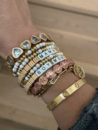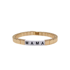 Our Mama Gold Line Bracelet features textured gold beads in a thinner, more petite size with the word "MAMA". Perfect gift's for Mother's Day, Moms to be or just because! Each bracelet is 7" in length, 7MM bead diameter and is a slip-on-style. All of our single bracelets are designed to be stacked or they can be styled to wear alone.