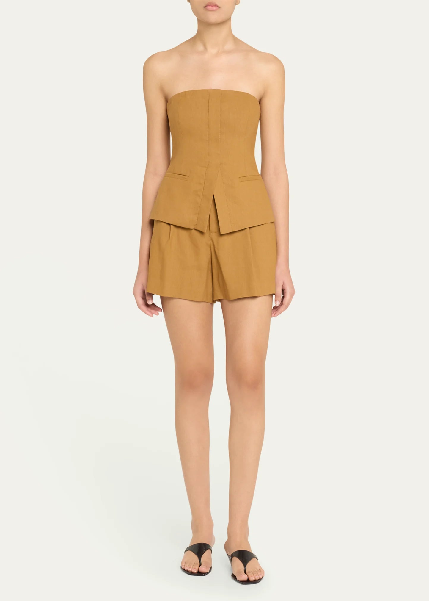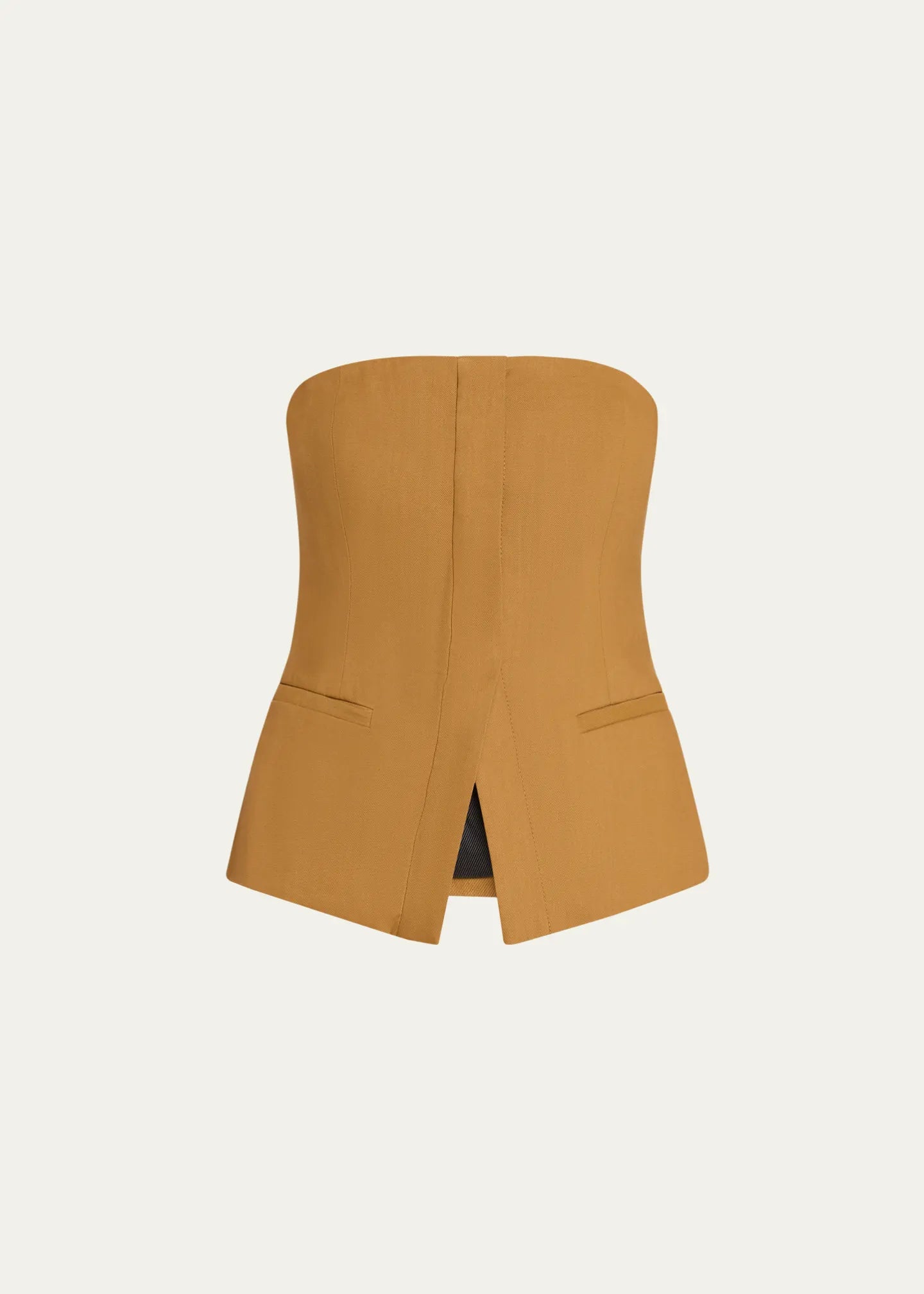 The Renee Top is crafted from our stretch cotton fabric in an Copper hue. This strapless top features a center seam that splits at the hem, offering an architectural take on corset dressing.