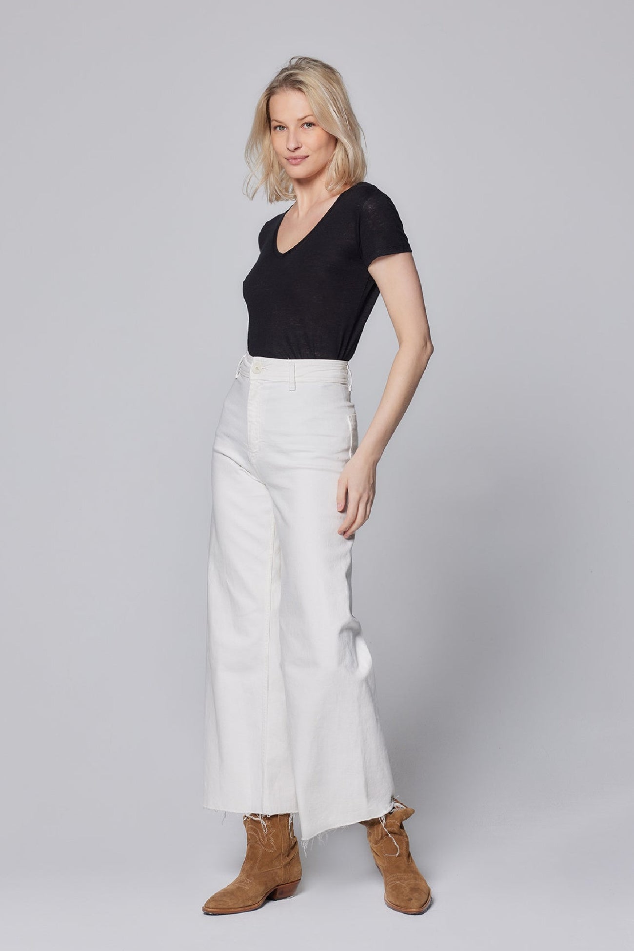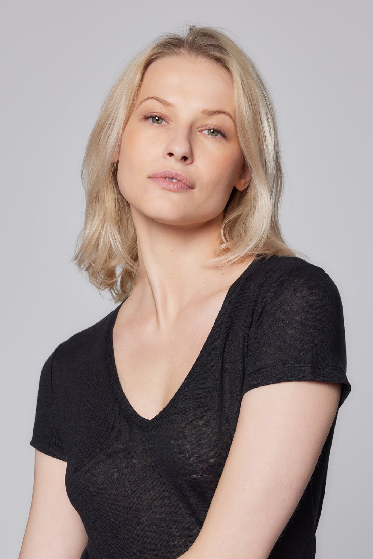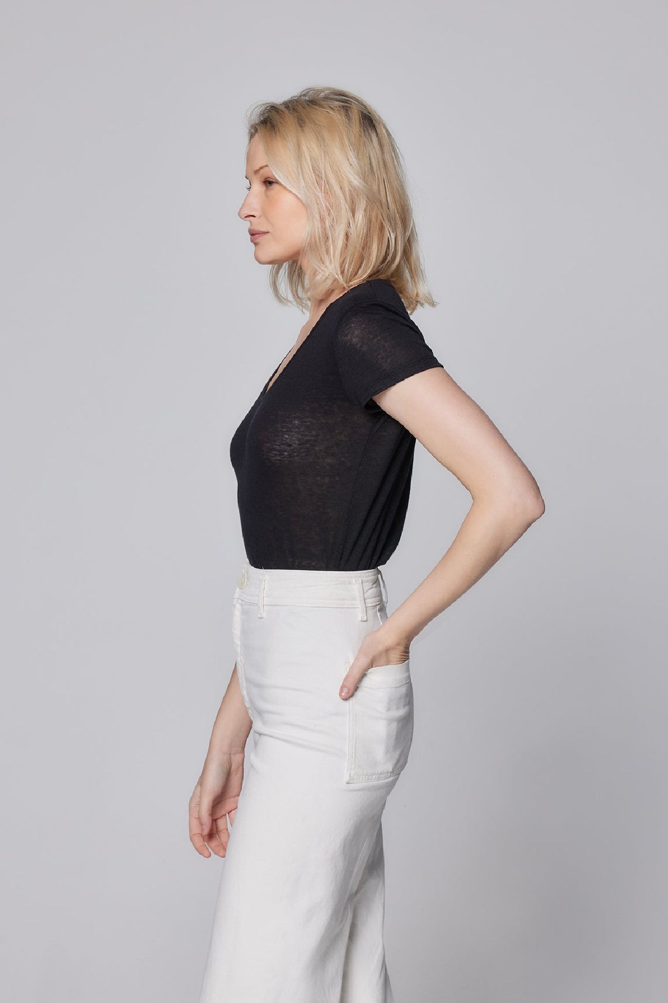 This short sleeve V-Neck features a soft buttery hand and a fitted silhouette.  The linen elastane blend is made from European long stem line with a unique finish that is cool to the touch and will never pill, stretch, fade or wrinkle.