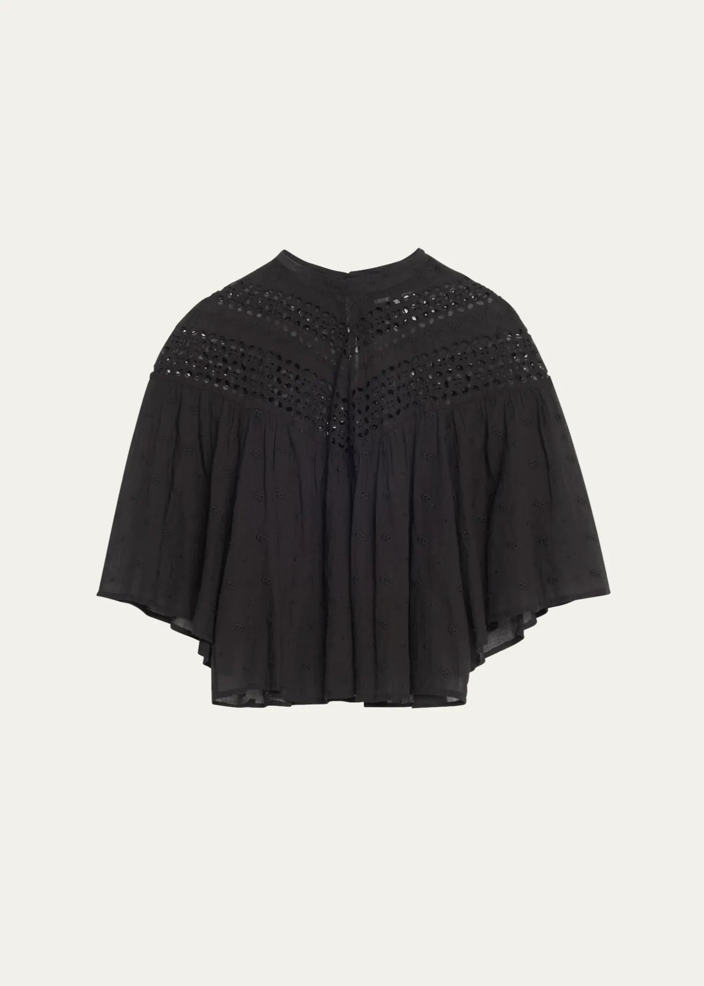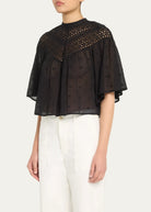 Cropped relaxed fit short sleeve blouse in Indian cotton voile. Custom Indian eyelet embroidery detail. Light shirring at front and back. Keyhole detail with button closure at back.