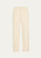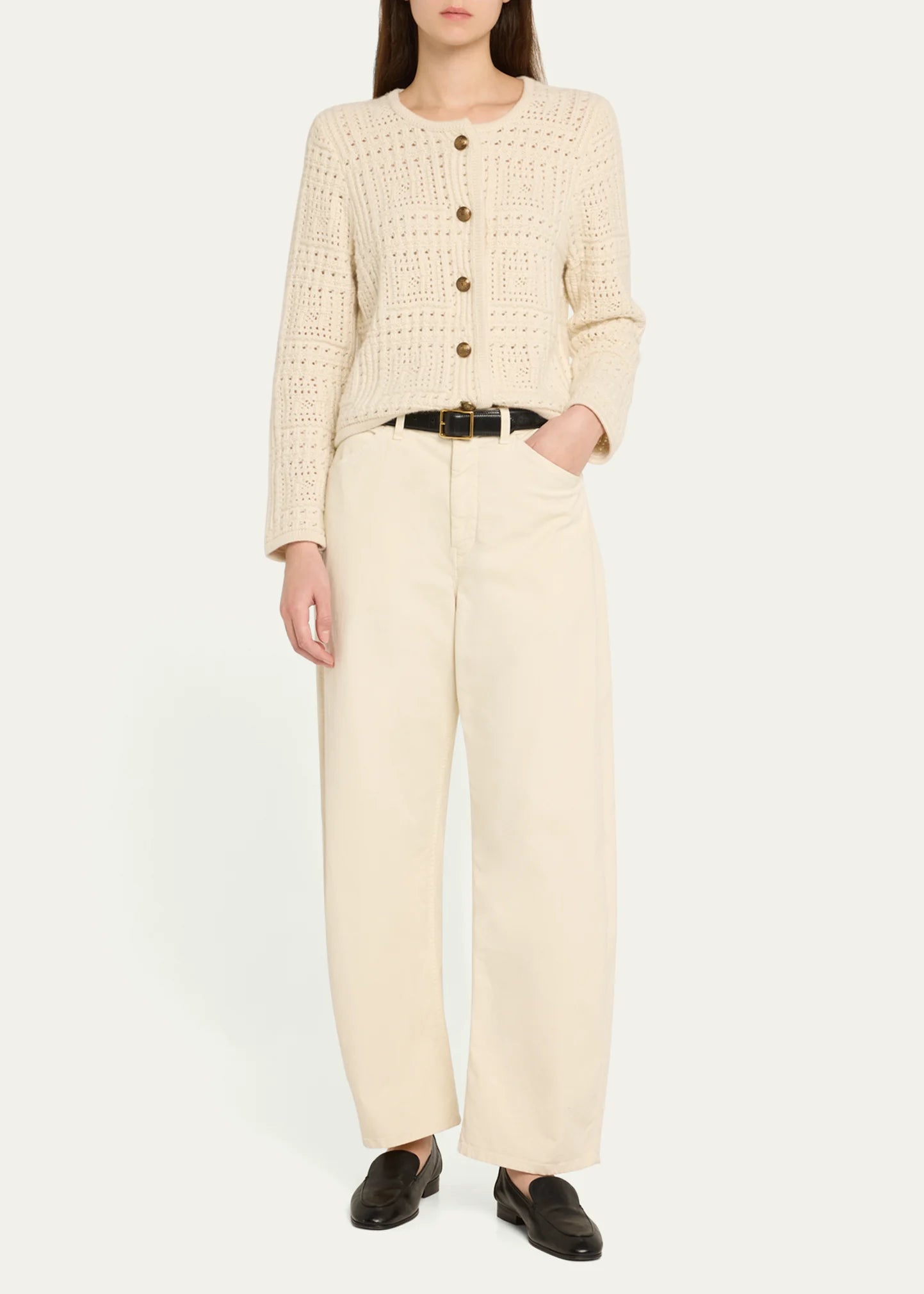 Mid-rise relaxed barrel leg pant in Italian brushed stretch twill cotton. Slant pockets. Back patch pockets. Coin pocket. Hidden hook-and-bar closure. Zip fly. Belt loops.