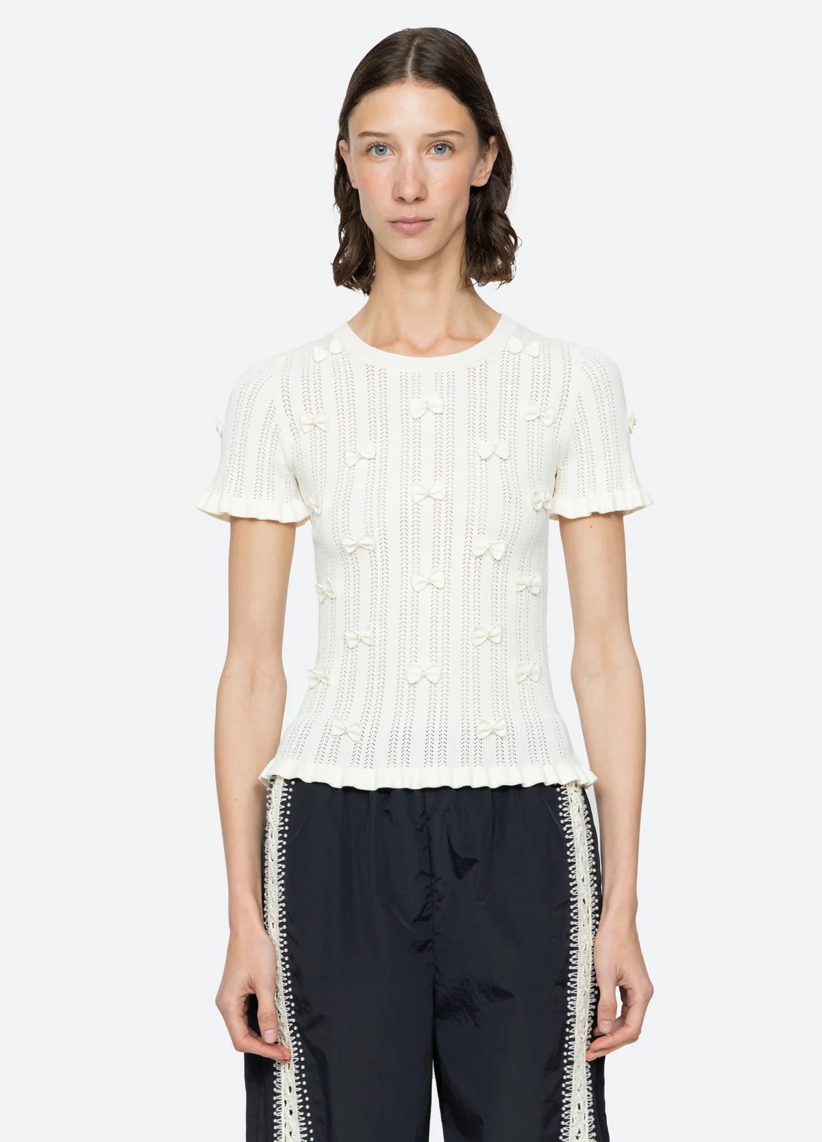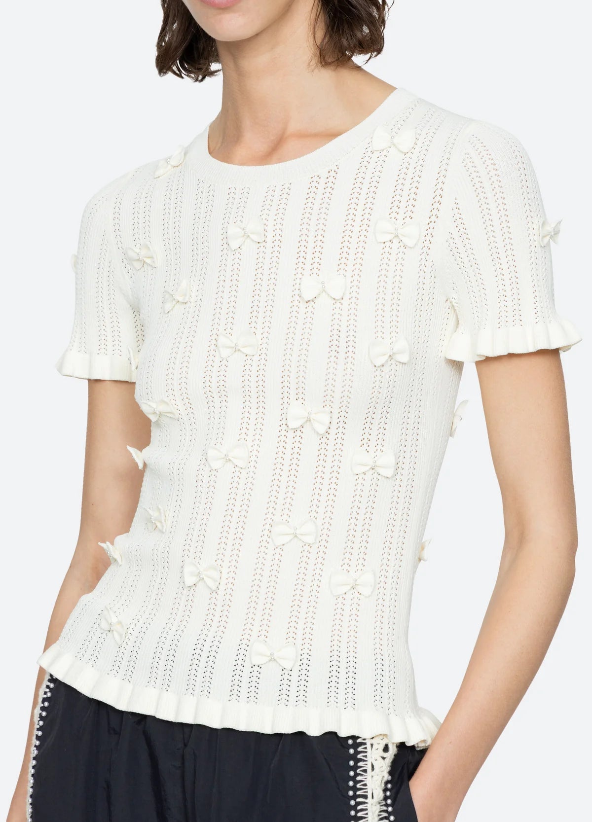 The Alberta pearl knit top showcases a refined pointelle stitch, offering an airy, feminine texture. It's accented with delicate bows adorned with pearl embellishments for a romantic finish.
