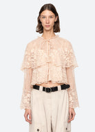 The Bronte embroidered top is crafted from sheer, embroidered mesh and features a romantic capelet overlay, long flowing sleeves, and a front tie closure. Its airy silhouette and intricate floral detailing evoke ethereal, feminine charm.