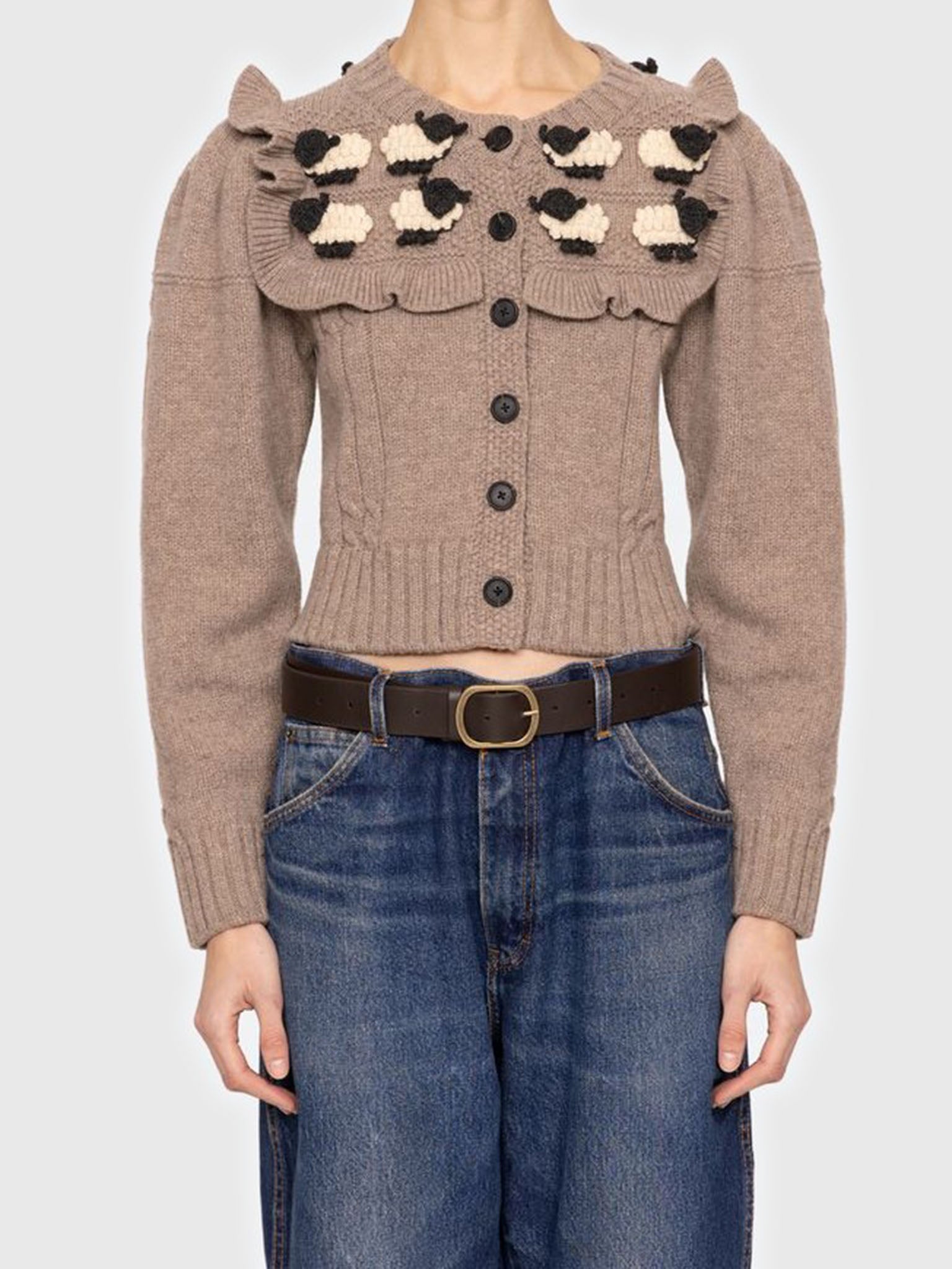 Sweet and statement-making, this cozy cardigan blends vintage charm with playful details. Featuring delicate crochet sheep appliqués, soft ruffle trim, and a flattering cropped silhouette, it brings a whimsical, feminine touch to any outfit. Perfect for layering or standing out on its own.