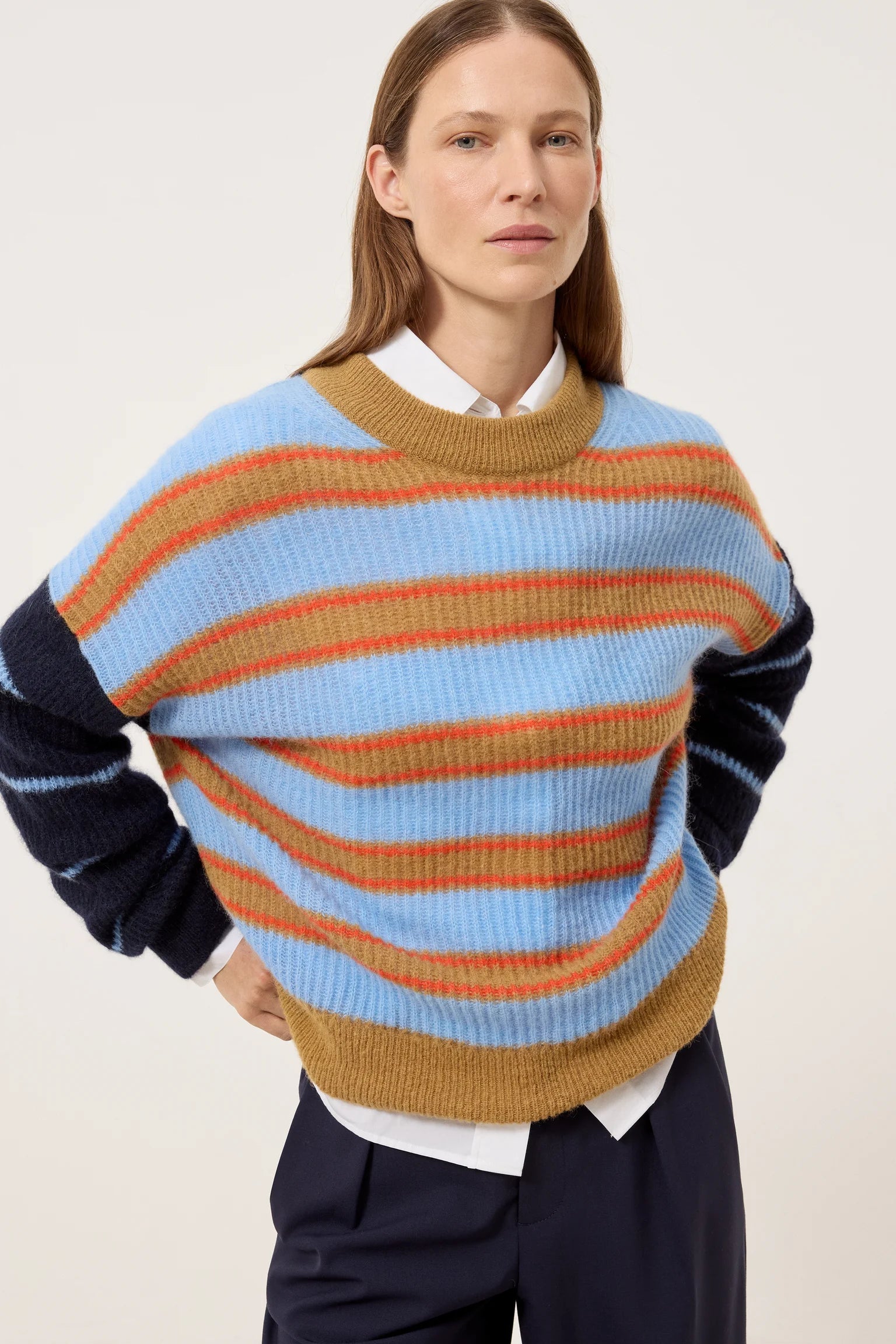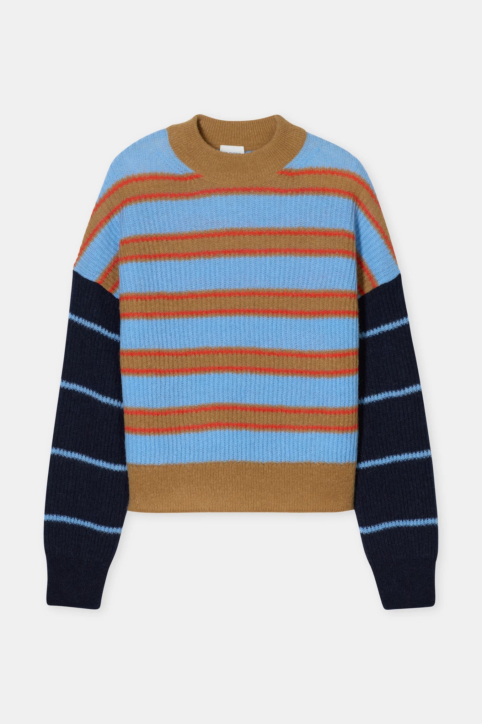 This soft knitted sweater with a round neckline is made from high-quality alpaca wool blend yarn and combines two different striped patterns with a classic ribbed texture. It features a plain neckline and fine ribbed cuffs on the sleeves and straight hem.