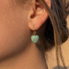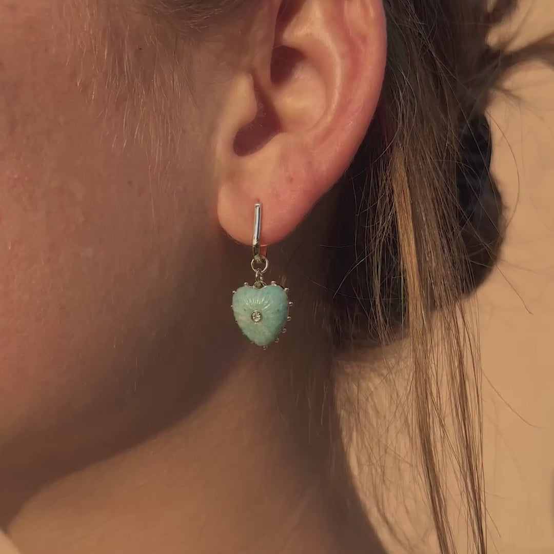 Description: Striking hand-carved Amazonite hearts with a sparkling center stone dangling on sleek hoops. Charms are removable for a modern, everyday hoop.