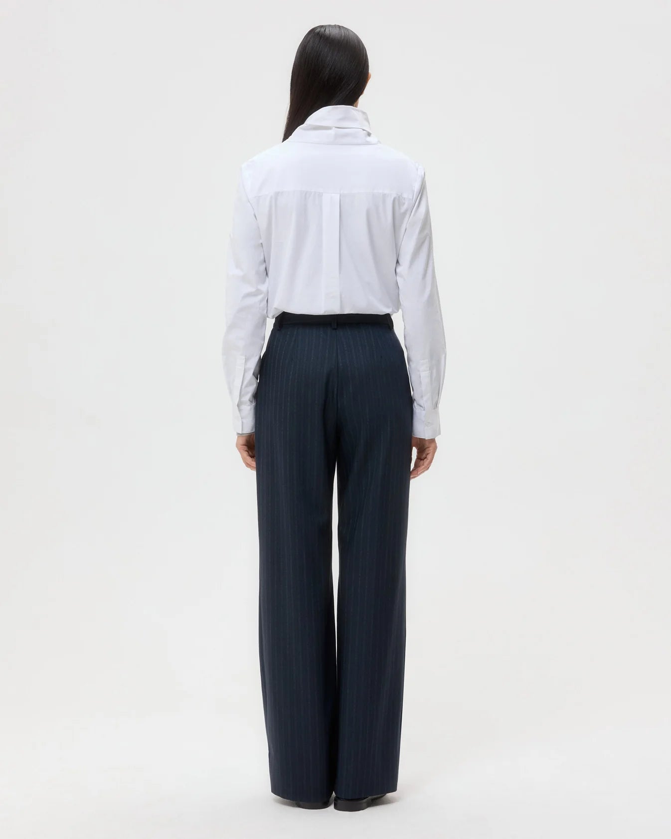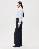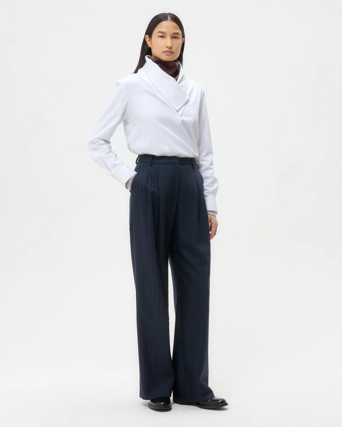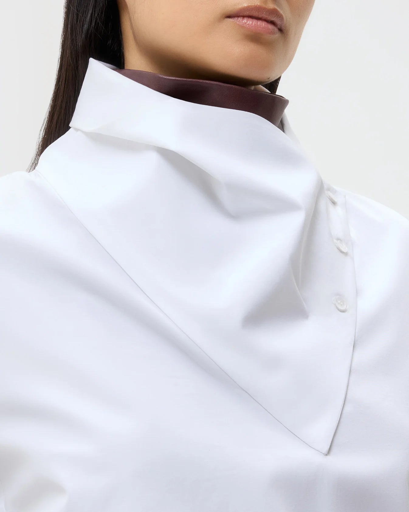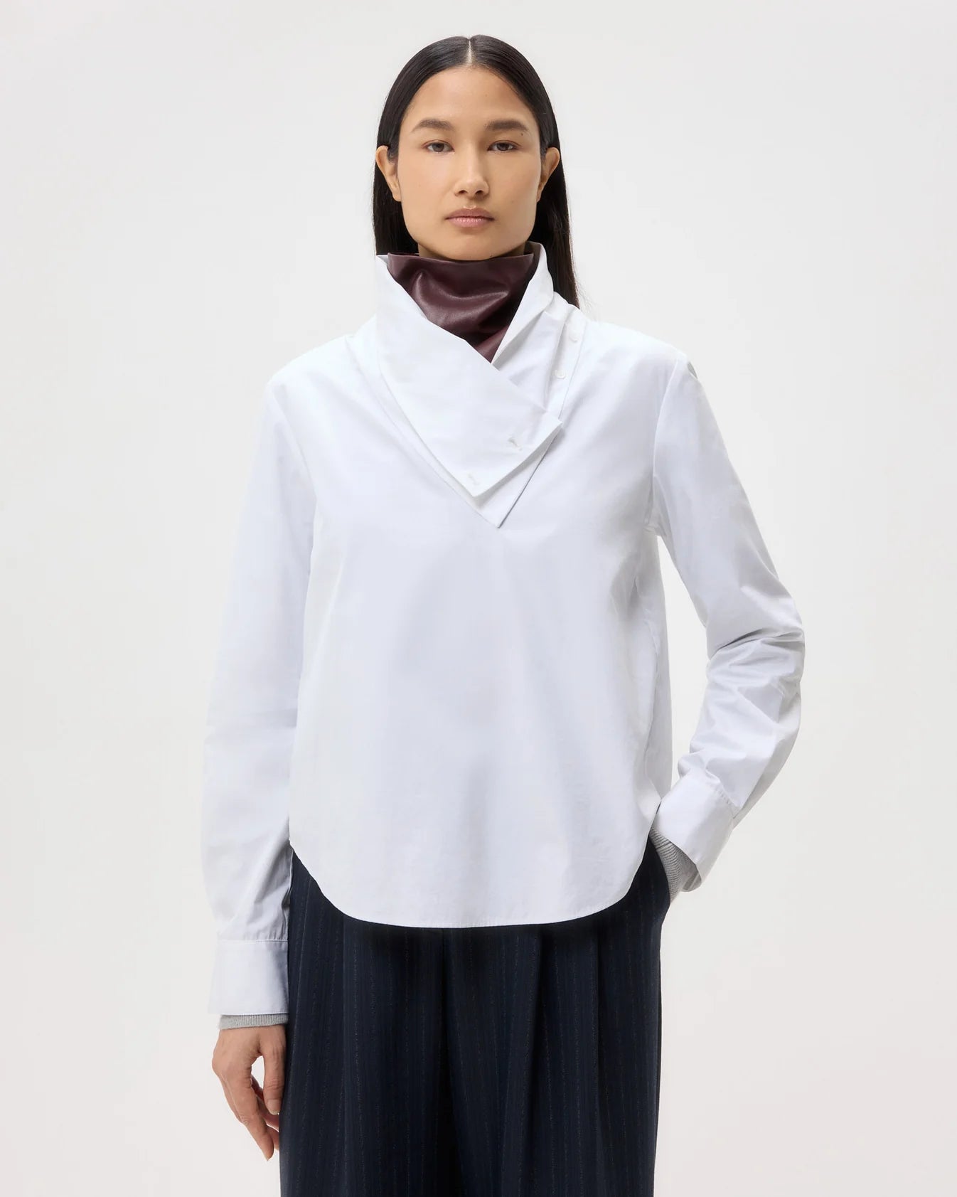 Long-sleeve, funnel neck blouse in super compact poplin. This dense cotton shirting is structured with a soft hand feel. My Maria is a relaxed fit, with an asymmetrical fold over collar that can be buttoned up or down. Complete with a center box pleat at the back, barrel cuffs and curved hem.