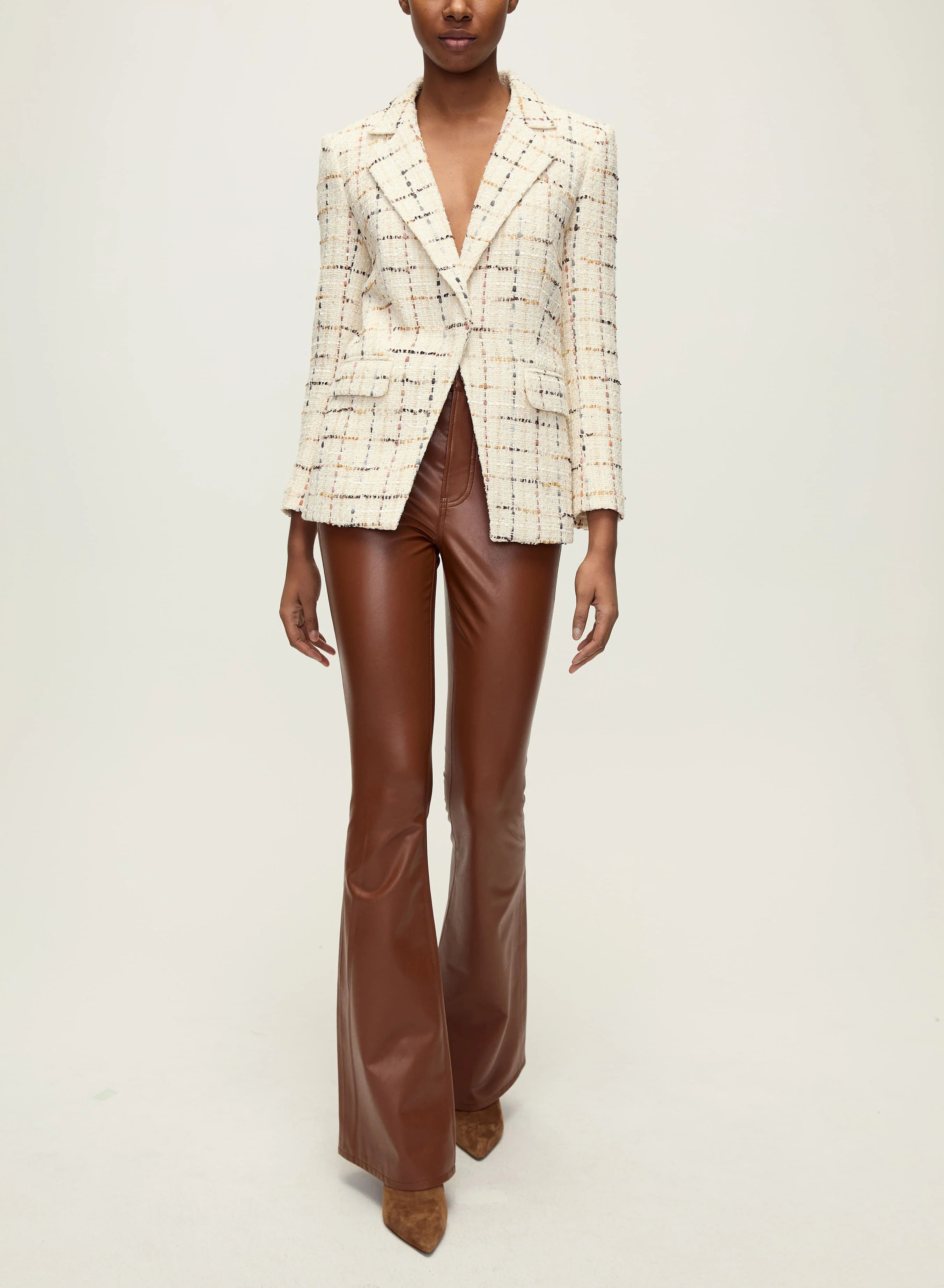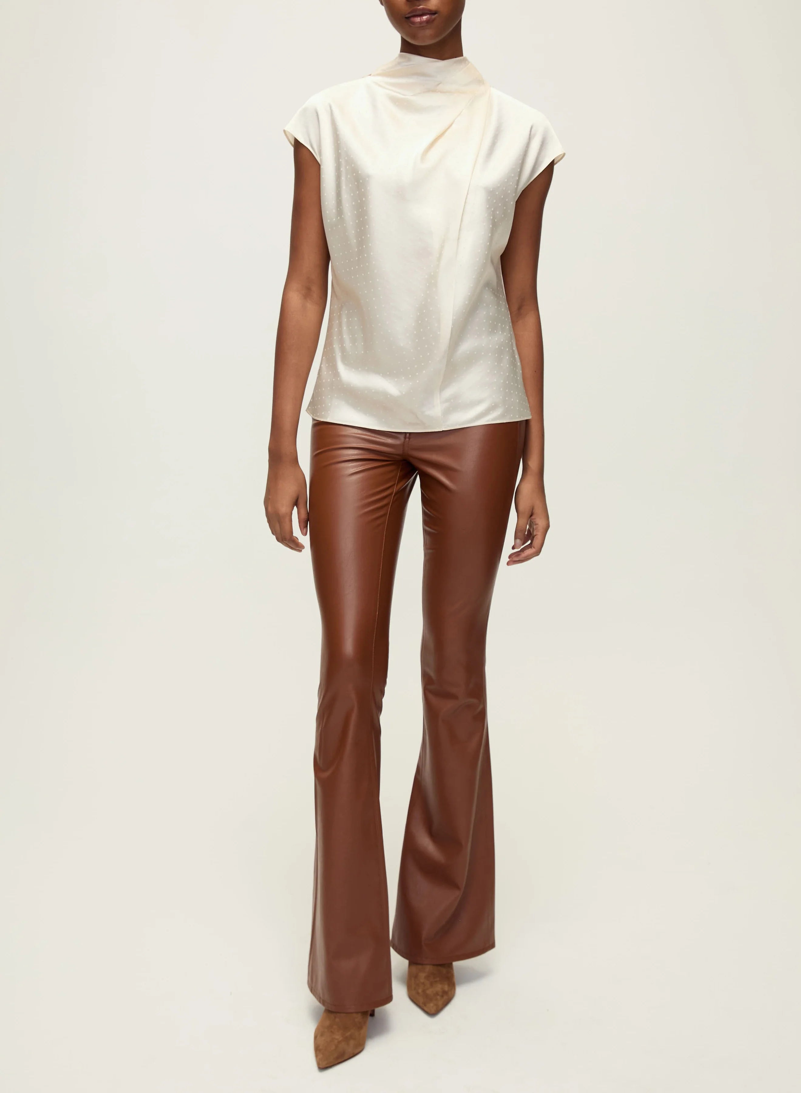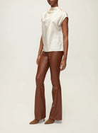 The Beverly is a VB favorite, now updated in sleek vegan leather. Everything else you love about the style remains the same—from the high-rise to the skinny-flare silhouette that gives you legs for days. Front patch pockets and our signature V-shaped belt loop in the back complete the look. Pair these vegan leather pants with a tee, a dickey jacket and heels for a new take on the classic VB look.